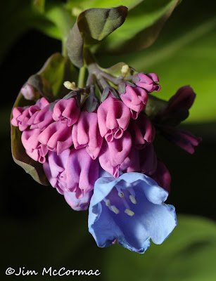 Virginia Bluebells, Mertensia virginica, were just starting to unfurl. One might argue that newly emerged plants, such as this one, are the showiest. The pink buds are punctuated by the first bright blue flowers. By now, this expansive hillside will be covered with acres of flowering bluebells.