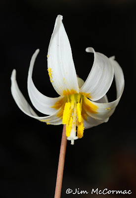 Hardy White Trout Lilies, Erythronium albidum, were flowering in numbers most everywhere. These graceful lily is always one of the very first wildflowers to pop up. As is always the case with small plants, the photographer must go prostrate to present them well. I had my head pressed into the forest humus to get an upward angle of the gorgeous six-petaled flower, which is only held 6-8 inches aloft on its bare flesh-colored peduncle.